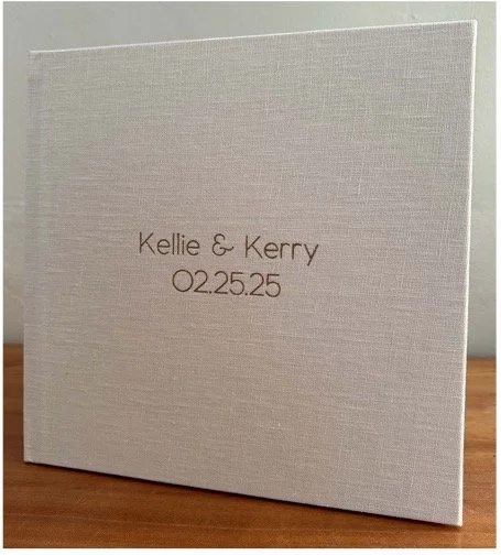 Choose from real leather, eco-friendly leather, or linen covers, with your first names and wedding date embossed on the cover.